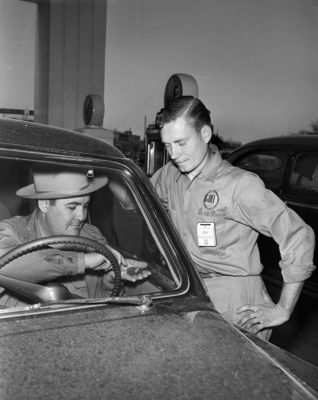 Wilbur F. King of 6324 Kenwick, counts his change before dropping it into the pocket "mailbox" worn by attendant Billy McDaniel for March of Dimes funds at the Gulf Station at Pennsylvania and Henderson. Attendants at seven oil companies' stations are collecting for the fund to fight polio. Published in Fort Worth Star-Telegram morning edition January 21, 1951.