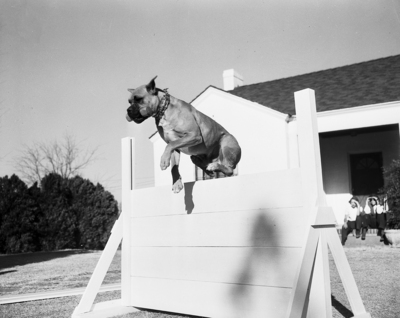 Image shows Chandelle v. Jere, a boxer owned by Charles C. Wehrung, clearing a hurdle at three feet and four inches during one of the performances required for dogs in the obedience tests that would be held by the Fort Worth Dog Training Club. Published in the morning edition, January 21, 1951.