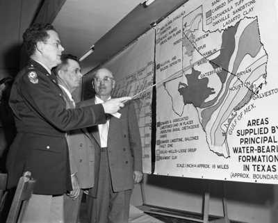 Colonel Louis Prentiss, left, of the Army Corps of Engineers, southwestern division, points out a fact concerning Texas underground water to C. M. Puckett, center, of Fort Stockton, president of the Texas Soil Conservation Supervisors, and C. M. Caraway of De Leon, chairman of the state Soil Conservation Board, at the Texas Soil Conservation Supervisors convention at Mineral Wells. Published in Fort Worth Star-Telegram morning edition January 19, 1951.