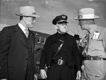 Roscoe Wallace, left, and Charles Cotten, right, chatted with McKinney Police, am C. E. Fraze during a stop on a chartered bus trip boosting the Southwestern Exposition and Fat Stock Show.