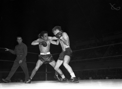 Frank Gasca, left, sets right while Oren McLain gets ready with left as two novice featherweights exchange in close in Golden Gloves bout. Gasca captured decision. Published in the Fort Worth Star-Telegram morning edition, January 20, 1951.