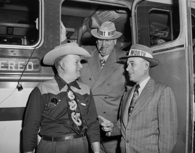 Louis W. Kuban, left, listens as R. T. Howard, right, explains how boosters of the Southwestern Exposition and Fat Stock Show planned to tell about the show at towns they were to visit. H. M. (Doc) Messer looks on approvingly form the door of the chartered bus. Published in Fort Worth Star-Telegram evening edition January 19, 1951.