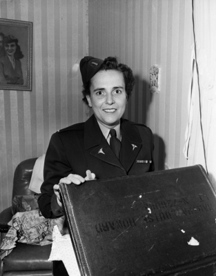 Image shows Martha Louise Howard, Army nurse, in uniform holding an unidentified box.