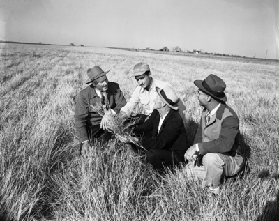 Image from a series on Soil Conservation at Pilot Point, published in the Fort Worth Star-Telegram's Ranch and Farm News. The Image shows Len Smotherman, second from the right, showing some of the King Ranch (KR) grass that he had grown to three of his neighbors. Left to right, the image shows W. M. Pierce, Bobby George, Smotherman, and Andy Flusche. Published February, 1951.