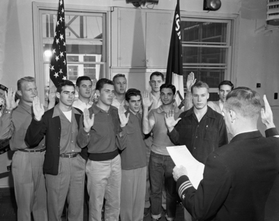 Commander W. T. Samuels, right, foreground, gives naval reserve oath of office to 10 Texas Christian University (TCU) grid men. Front row, left to right, are Tom Mercer, Teddy Vaught, Manager Walter Echols, Jack Hunter and John Ramfield. Back row, left, Jim Amburg, Jack Ramsey, Jack Temple, John Harville and Paul Hoeffler. The Frogs' quarterback, Gilbert Bartosh, and Hubert Parrett already have joined. Published in Fort Worth Star-Telegram morning edition January 20, 1951.