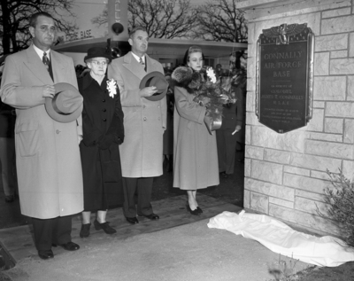 Standing from left to right is: Senator Lyndon B. Johnson, Mrs. C. B. Connally, Air Secretary Symington, and Mrs. James T. Connally.