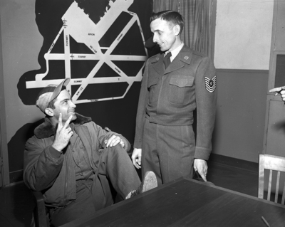 Image shows Staff Sargeant Robert R. McLeroy, seated left, radio operator, holding up two fingers to indicate his second flight from England to Fort Worth. McLeroy is a member of the "Lucky Lady II" crew that made a non-stop globe circling flight. Master Sargeant Lawrence M. Brown, right, in uniform is listening. Published in the Fort Worth Star-Telegram morning edition, January 22, 1951.