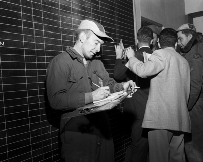 Image shows Master Sargeant T. A. McCarthy, flight engineer, checking over forms after completing non-stop flight in B-36 from England to Carswell Air Force Base. He is shown leaning on wall while completing forms. Left is four unidentified Air force members. Published in the Fort Worth Star-Telegram morning edition, January 22, 1951.