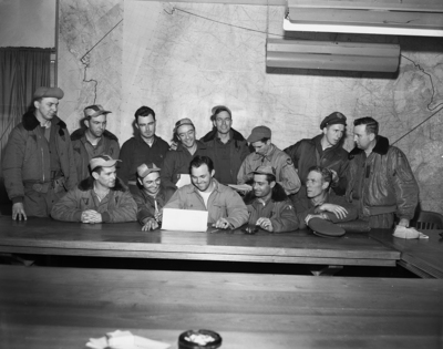 Image shows the 13 members of the crew headed by Captain Bobbie J. Cavnar, 25, which was picked for the mission because it has twice won the 7th Bomb Group award for "best crew". Seated, left to right, are Staff Sergeant Paul R. Windham, mechanic-gunner; Master Sergeant W. H. Wedeking, flight engineer; Captain Cavnar; Staff Sergeant Robert R. McLeroy, radio operator; and Staff Sergeant William Chapman, tail gunner. Standing behind them are Sergeant Robert E. Bielinski, radar mechanic; Staff Sergeant William Shafer, gunner; Captain Ray F. Lemoine, pilot; Master Sergeant T. A. McCarthy, flight engineer; Staff Sergeant Clarence Harris, radio operator; First Lieutenant Tim Lane, radar navigator; First Lieutenant B. J. Thompson, second navigator; and First Lieutenant Francis J. Gstrein, first navigator. Other crew members, not shown, were Major Edwin D. Easley, pilot; Tech Sergeant Leon C. Phillips, gunner; First Lieutenant John W. McKim, flight engineer, Stagg Sergeant C. N. Tucker, gunner; and Captain Fred M. Mitchem, radar specialist. Published in Fort Worth Star-Telegram morning edition January 22, 1951.