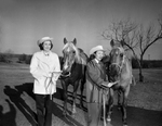Image shows members of the Fort Worth Horseshoe Club who are to ride in the parade opening the Southwestern Exposition and Fat Stock Show. Dismounted off their horses are, Mrs. M. M. Calvin, left, and Mrs. C. Gordon Arnold. Published in Fort Worth Star-Telegram morning edition January 23, 1951.