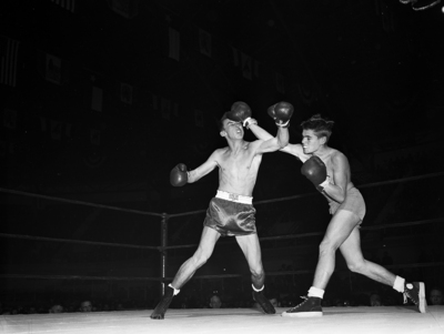Monte Mitchell of Amon Carter Riverside, left, was too late to block off a punch by Poly's Leonard Smith in High School flyweight bout. Mitchell, however, won the title on a decision. Published in the Fort Worth Star-Telegram morning edition, January 23, 1951.