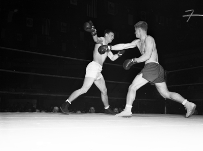 Roland Maclin, right, smashes a right to the face of Ronnie Westmoreland in light-heavy-weight battle. Maclin scored TKO in second round. Published in the Fort Worth Star-Telegram morning edition, January 23, 1951.