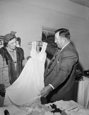 Image shows C. T. Sheats, holding lingerie, of Austin, president of the National Fashion Exhibitors of America, right, advising Mrs. A. D. McAllister, in fur coat, buyer from Fayetteville, Arkansas, to stock up on nylon lingerie at the market at Hotel Texas in anticipation of shortages of the fabric. Published in the Fort Worth Star-Telegram morning edition, January 23, 1951.