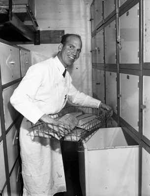 Image shows Ray Black, president of the Callahan County Luncheon Club working in his general store at Baird. Published in the Fort Worth Star-Telegram morning edition, February 4, 1951.