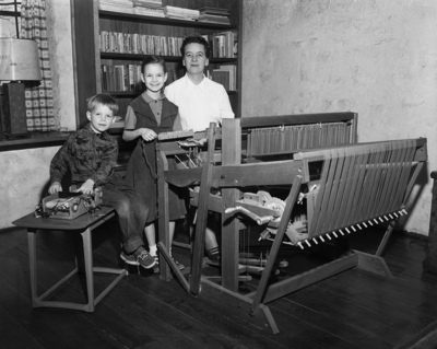 Sandy, left, and Queedie, center with Mrs. John Wesley Jones, 1708 Sunset Terrace, have looms of their own and are learning the pleasure of making something with their hands. Published in Fort Worth Star-Telegram morning edition January 26, 1951.