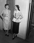 Modeling summer clothes at the National Fashion Exhibitors market at Hotel Texas are, left, Miss Phyllis Webster, 3712 South Hills, in an imported linen "duster" over a sheath dress, and right, Miss Pat Perkins, 1116 S. Henderson, in a black linen sheath topped with a white eyelet batiste peplum jacket. Published in Fort Worth Star-Telegram morning edition January 24, 1951.