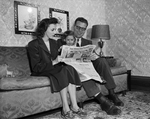 Mrs. Kenneth Gire points to the announcement of the appointment of her husband, right, as the head coach at North Side High School. The Gires' 3-year-old daughter, Lona Linda, grins, too.