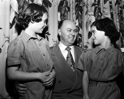 Image shows District Judge Robert Young, center, next to two Girl Scouts at the annual meeting of the Fort Worth Girl Scout Council. Left is Kathleen Glen-Walker, daughter of Mrs. Flora Glen-Walker, 3701 Monticello Dr. and right is Melissa Morris, daughter of Dr. and Mrs. A. J. Morris, 3661 Monticello Dr. Published in the Fort Worth Star-Telegram morning edition, January 25, 1951.