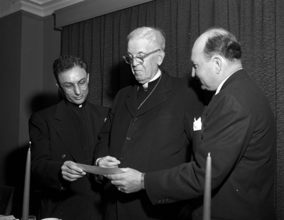 Image shows Bishop Joseph P. Lynch of Dallas, center, receiving a check for $400 from president Frank E. Crumley, right, and Reverend L. M. DeFalco, chaplain of Serra Club, left, at a dinner. The money will be used for assisting the education of priests from the Dallas diocese. Published in the Fort Worth Star-Telegram morning edition, January 25, 1951.