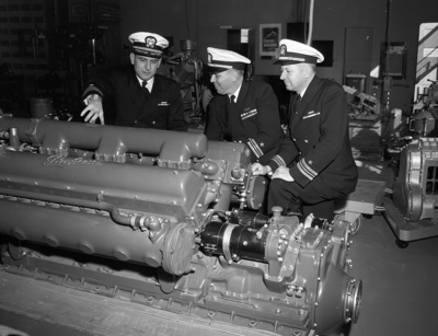 Image shows three members of the United States Navy inspection board. They found the Surface Divisions 885 and 883 United States Navy Reserve (USNR), satisfactory after a two-day survey. They are shown looking over a PT-engine. From left to right, Commander Edwin K. Jones of Dallas, Lieutenant Commanders Kenneth E. Spangler of Abilene, and John C. Clovis of Wichita Falls. They are all regular Navy inspector- instructors. Published in the Fort Worth Star-Telegram evening edition, January 25, 1951.
