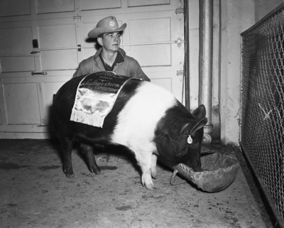 The Grand Champion barrow of the Southwestern Exposition and Fat Stock Show is shown with his owner, John Bridges, 4-H Club member from Hart in Castro County. The 230-pound animal earlier was judged Grand Champion of the boys' pig show.