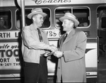 T. P. Hendrick, left, and J. Harold Evans are shown chatting before boarding chartered buses here for the last two of seven booster trips made in behalf of the Southwestern Exposition and Fat Stock Show. Shown are the men wearing hats, smiling and shaking hands. Published in Fort Worth Star-Telegram evening edition, January 24, 1951.