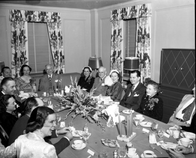 Carter Files. Left to right: Ernest Allen, Governor Allen Shivers, Amon Carter and W. R. Watt. Also series not published. Amon Carter is at the head of the table smiling. The shot is showing the table of all of the guests.