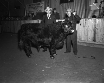 Reserve champion is W. L. Impression 16th, shown here with Homer Clausen of Spencer, Iowa, shorthorn judge and one of the owners, Bill Anderson of W. C. Anderson and Son Farms in West Liberty, Illinois.