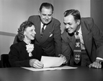 Image shows Mrs. Aline Burden, left, seated and talking over the program for the annual education night of the National Office Management Association with Paul Kautz, center, and Wayne A. Clark, right. The meeting will be January 30 in Hotel Texas. Published in the Fort Worth Star-Telegram morning edition, January 26, 1951.