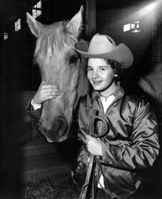 Image shows Sharon Hildreth, daughter of Mr. and Mrs. Volney Hildreth, Aledo, is giving her horse, Flying H, a hug for qualifying for the second consecutive year in the cutting horse contest. She is shown to be inside a barn. Published in the Fort Worth Star-Telegram evening edition, January 26, 1951.