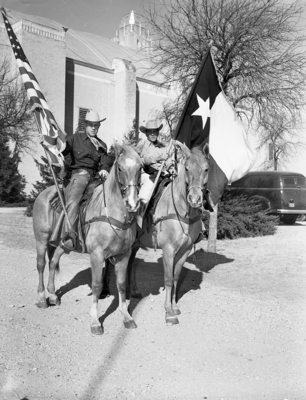 Hank Mills, left, of Pueblo, Colorado, and Bill Iler of Fort Worth are shown as they started their ride to T and P Reservation to take their places as flagbearers in the downtown Southwestern Exposition and Fat Stock Show.