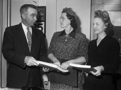 Pictured here is Mrs. C. E. Humphrey, center, receiving last minute instructions from the County Tax Assessor-Collector Stewart and Tax Deputy Miss Doris Boyd before opening one of 42 poll tax sub stations.
