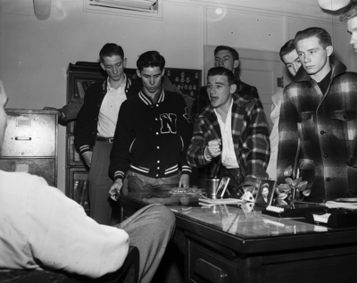 North Side students querying Public Schools Athletic Director Herman Clark over him not recommending Morris are, from left to right, Toppy Ponder, Herbie Teasley, and Billy Dollar.