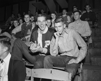 Two Texas Christian University (TCU) frosh cage stars, Paschal's Henry Ohlen, left, and Arlington Heights' Vergil Baker watched their alma maters' game. Ohlen was pleased with Paschal High School's win, with 32-30. Published in Fort Worth Star-Telegram morning edition January 28, 1951.
