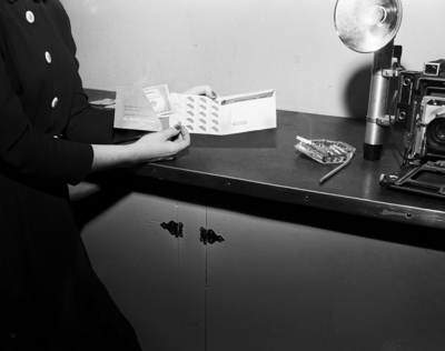 Image shows a shot of March of Dimes holder. An unidentified person is holding a dime holder on a table next to a camera. Contributions of dimes and dollars are to be sent to Stewart W. Hellman, 1951 March of Dimes, Post Office box 1511, Fort Worth. Published in the Fort Worth Star-Telegram morning edition, January 30, 1951.