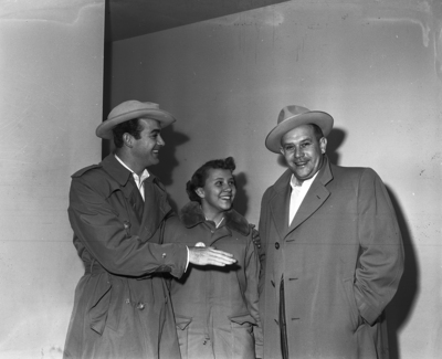 Mark Stevens, left, top flight movie star, arrived here for the rodeo and to root for Patty Ward, 12, center, who will ride at the horse show with her brother, Gene, 14, showing part of the seven horse gaited stake entered by their father, Fred Ward, right, Denver stable owner and automobile distributor.