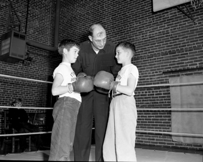 Jimmy Guinn left, and Jerry Warren, Subnovoice paperweights, listen to Referee Milton Coffey at Fort Worth Boys Club. Two boys with boxing gloves and a man bending over in center to talk to them.