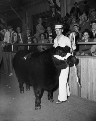 Popeye, 930-pound steer bred by Lutter McClung of Fort Worth, was adjudged boys' Angus champion at the Stock Show. The animal was shown by Billy McAnelly of Tulsa, pictured with the steer.