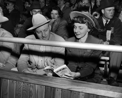 Mr. and Mrs. Tommy Brook of Camp San Saba check their catalog as they watch progress of their registered Aberdeen- Angus cattle in the 1951 Southwestern Exhibition and Fat Stock Show. Published in Fort Worth Star-Telegram evening edition February 2, 1951.
