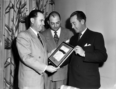 Image shows Basil Roper, right, business manager of Texas Motors, 1101 W. 7th, receiving a Four Letter Award plaque from D. R. Crandell Jr., left, Dallas district manager for the Ford Motor Company. Center is K. K. Kellam, sales manager for the Fort Worth company. The award for leadership in finances, management, spirit and facilities has been won twice by the firm. Published in the Fort Worth Star-Telegram morning edition, January 31, 1951.