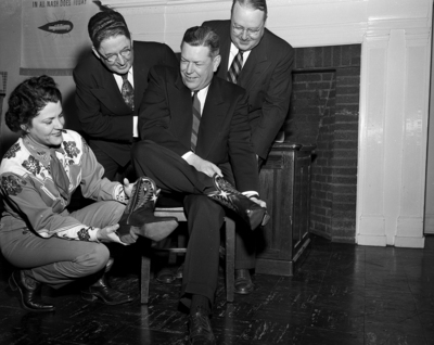 Image shows L. T. Kouns of Detroit, Nash automobile executive, seated right, is shown trying on a pair of boots presented by Mrs. Clyde Burns, Fort Worth Nash dealer, in preparation for a visit to the rodeo. Behind Kouns, from left to right is, R. R. Compton, St. Louis and H. S. Baker, Dallas, both Nash representatives. Published in the Fort Worth Star-Telegram morning edition, January 28, 1951.