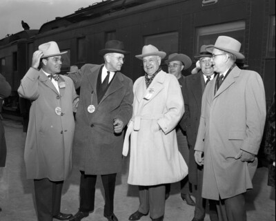 Southwestern Exposition and Fat Stock Show. Left to right: Hardy Murphy, Ardmore; Mac Q. Williamson, Oklahoma Attorney General; Ed L. Baker, and Dr. George L. Cross president of the University of Oklahoma. Another shot of the group at the train station. They are all laughing and smiling. The two men on the left both have their pins on their coats for the Stock Show.