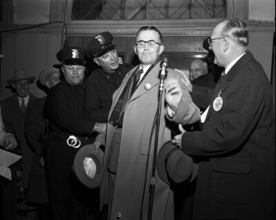 Southwestern Exposition and Fat Stock Show. Left to right: Hardy Murphy, Ardmore; Mac Q. Williamson, Oklahoma Attorney General; Ed L. Baker, and Dr. George L. Cross president of the University of Oklahoma. President Cross is seen here with a man to the right with officers to the left of the picture. Amon Carter is seen in the background.