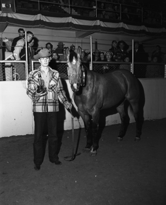 Jole Blon, a three-year-old buck skin mare, won the title of grand champion of the Quarter horse division at Southwestern Exposition and Fat Stock Show, is shown with Kenneth Casey, son of the horse's owner, Glen L. Casey of Amarillo. The mare also won the same title at shows in Denver and Chicago. Published in Fort Worth Star-Telegram morning edition January 29, 1951.