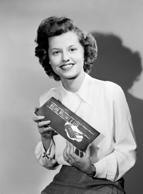 Jane Ann Ellis display enlarged ticket for first Texas League game. Published in Fort Worth Star-Telegram morning edition April 2, 1950.