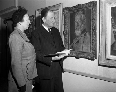 Image shows from right to left, Lord and Lady Wakehurst studying Augustus John's portrait of George Bernard Shaw. This portrait is part of Queen Elizabeth's contribution to a British art exhibition at Texas Christian University's (TCU) Fine Arts Gallery. Lord Wakehurst is head of the British Speaking Union (ESU), that sponsored the exhibition to the United States. It was brought her by the Fort Worth ESU group and TCU. Published in the Fort Worth Star-Telegram morning edition, January 29, 1951.
