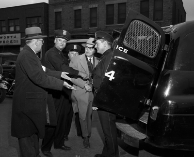 Image shows Fort Worth greeters playfully "arrested" Dr. George C. Cross, president of the University of Oklahoma, when a Southern Oklahoma delegation arrived for the Stock Show. Left to right, Dr. M. E. Sadler, president of Texas Christian University (TCU); Policeman C. W. Taylor and R. B. Dean; Dr. Cross and Policeman J. W. McCory. The three policemen are shown escorting Dr. George C. Cross into a police vehicle. Published in the Fort Worth Star-Telegram morning edition, January 29, 1951.