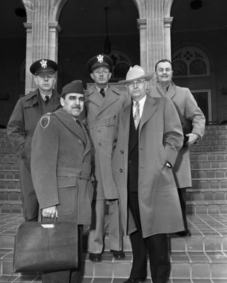 Image shows five officers standing on steps outside building. From left to right, Lieutenant Colonel R. H. Hayden, Colonel Jack D. Mage, shown with briefcase, Major Paul A. Vickers, Fred Brown, hotel man and Master Sergeant Richard H. Riddle. The officers are here to bring troops to re-activated Camp Wolters and perform an inspection. The four officers tour the 3,500-acre site. Published in the Fort Worth Star-Telegram morning edition, January 29, 1951.