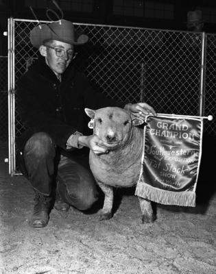 Dale Herring, 19, of Talpa, won the grand championship in the weather lamb class at the Southwestern Exposition and Fat Stock Show with this Southdown which also was champion of the boys' show. Published in Fort Worth Star-Telegram morning edition January 30, 1951.