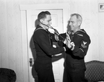 Image shows 53-year old Arthur G. Schmitt, right, a Seabee, in Navy uniform, holding his hands up while his son, Raymond Schmitt, left checks his dad's health with stethoscope. Raymond, hospital man in Navy, and Arthur are both on 30 day leave. Published in the Fort Worth Star-Telegram evening edition, February 1, 1951.